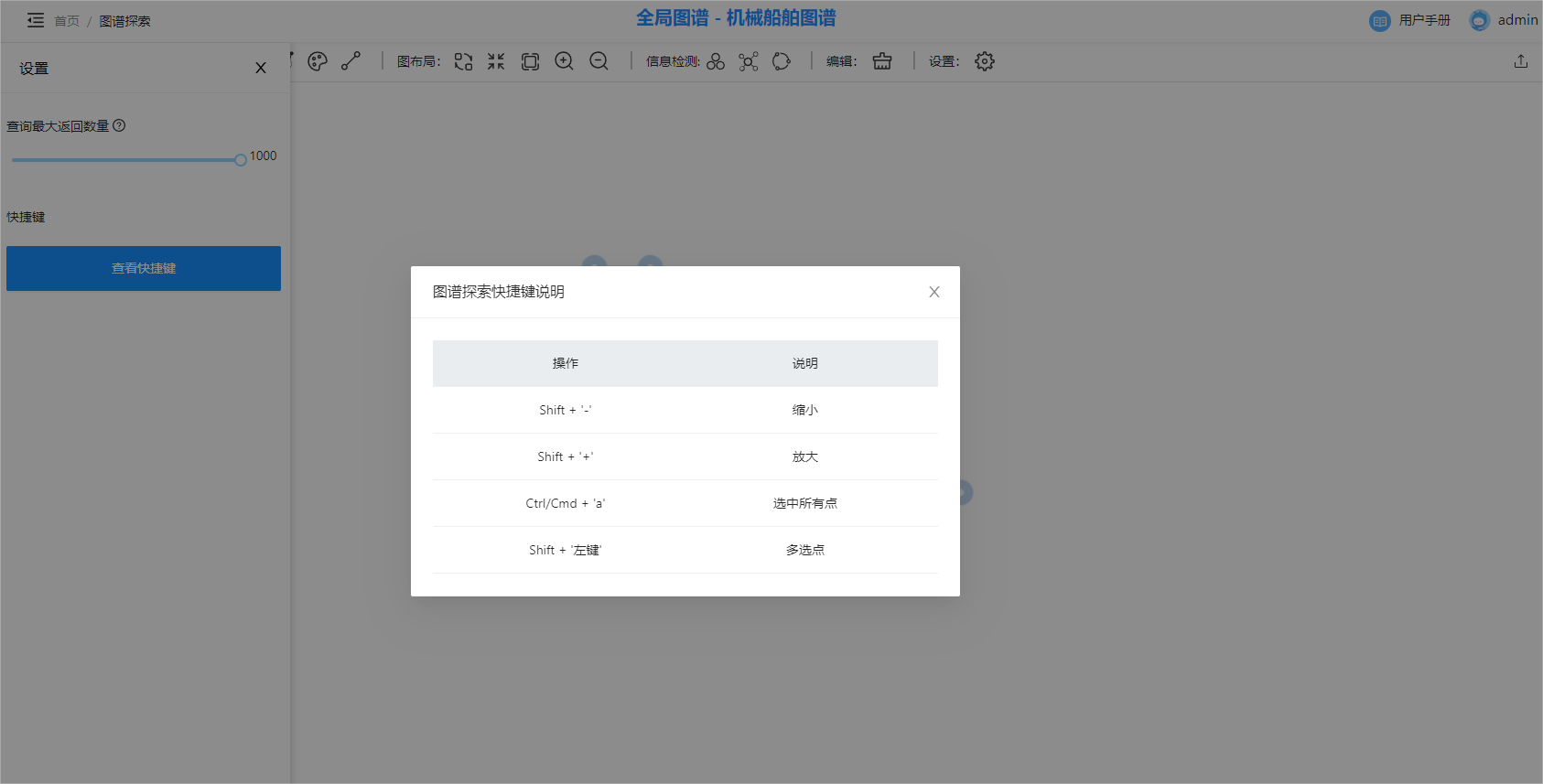 在“设置”中可查看快捷键设置,熟练使用快捷键可以帮助用户更快捷地操作图谱。快捷键功能如图所示: