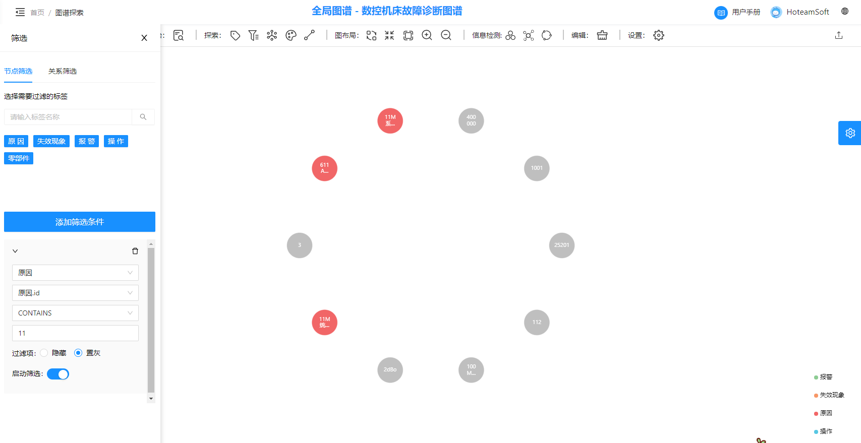 示例:过滤画布中原因 id 中包含“11”两个字的节点。