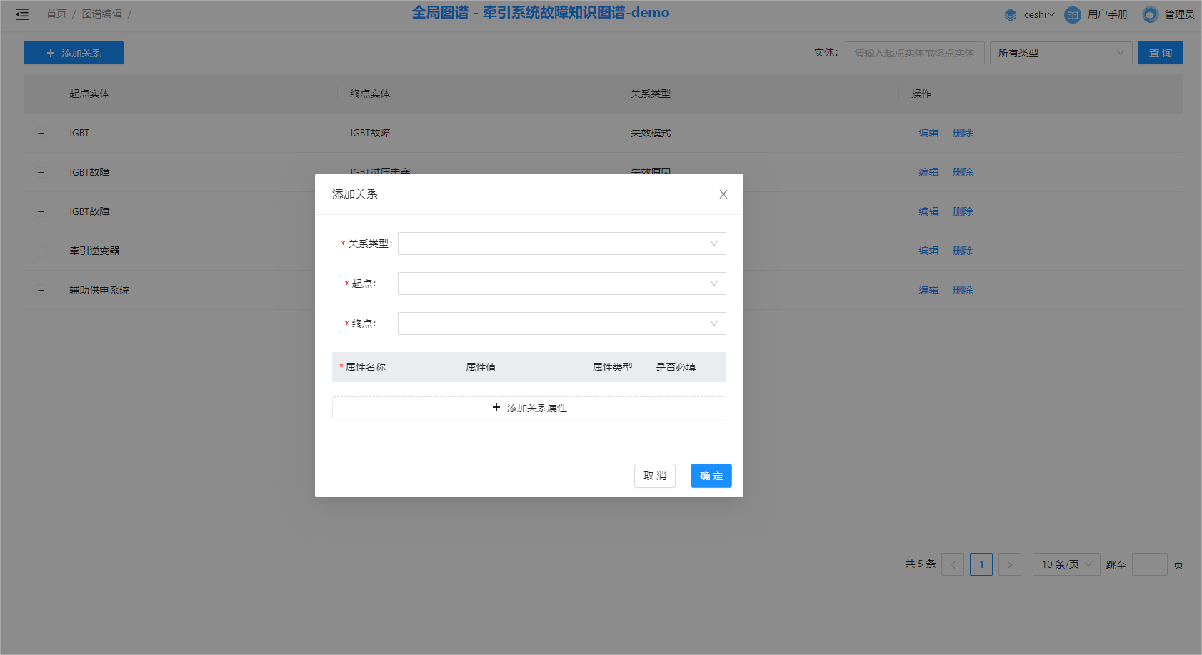 进入图谱编辑-关系编辑页面,点击左上角“添加关系”,在弹出表单中填写信息。