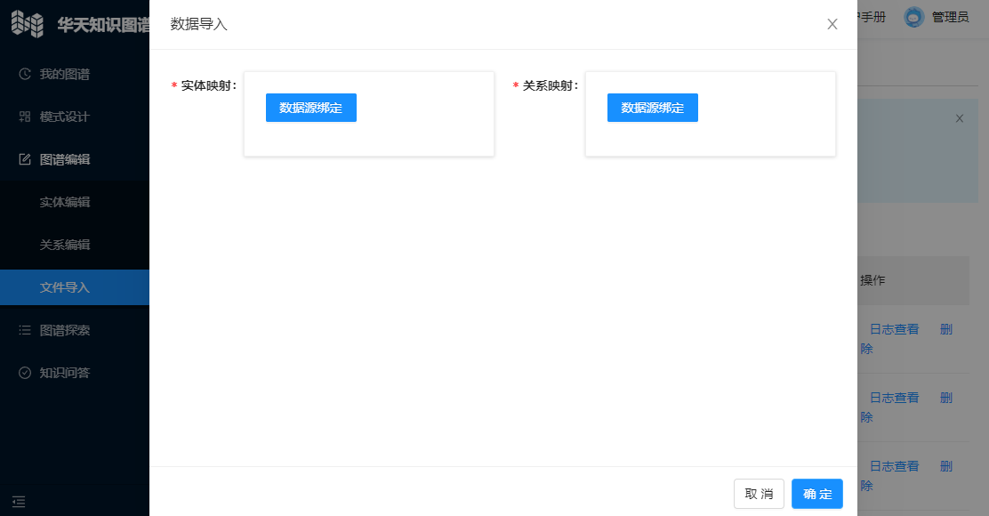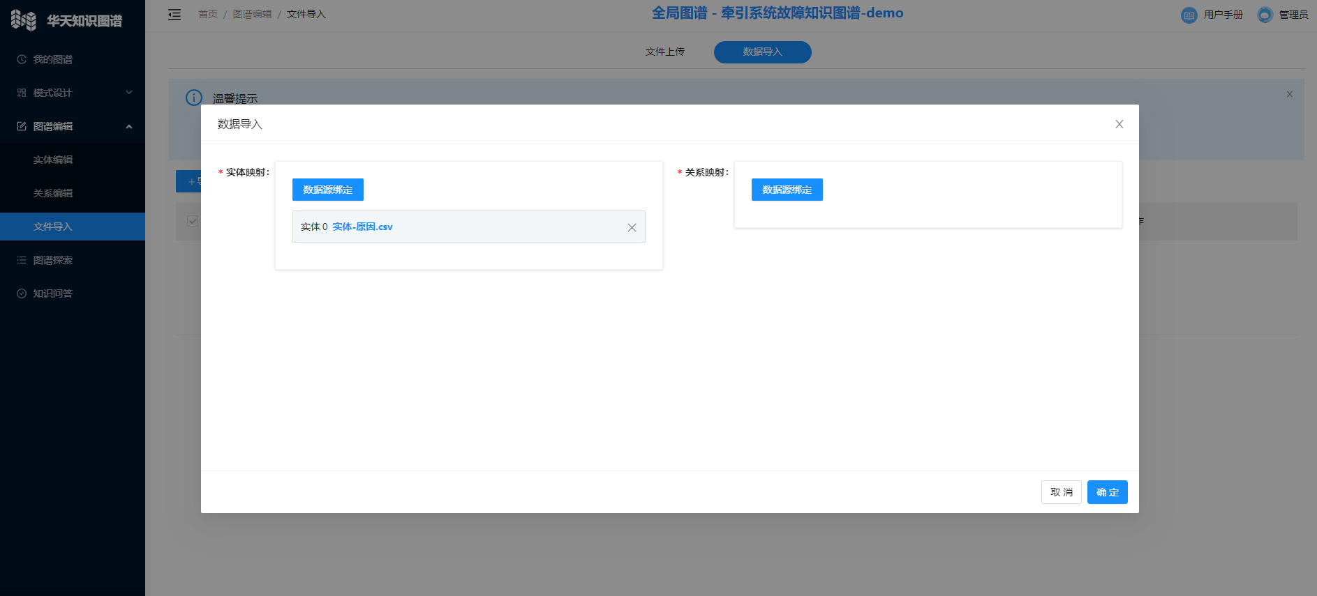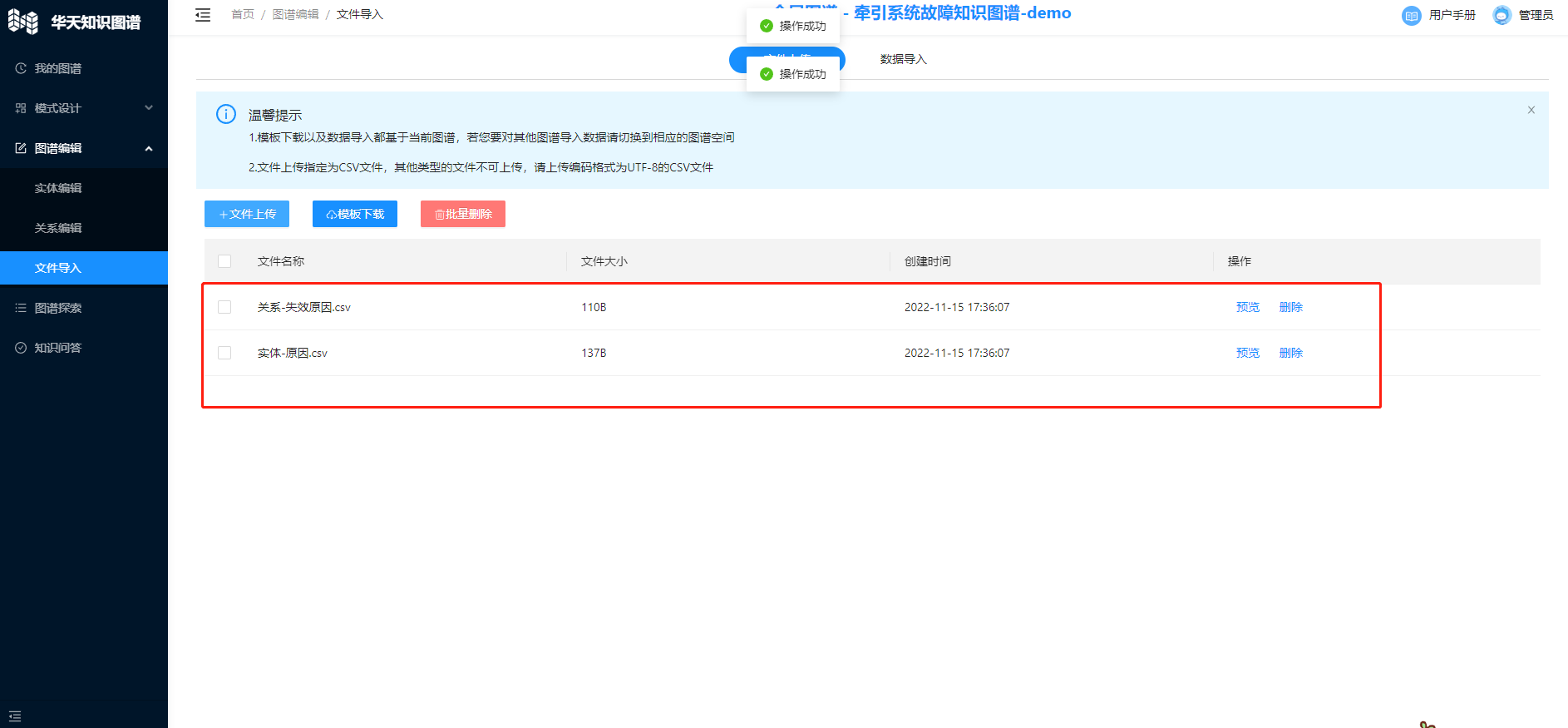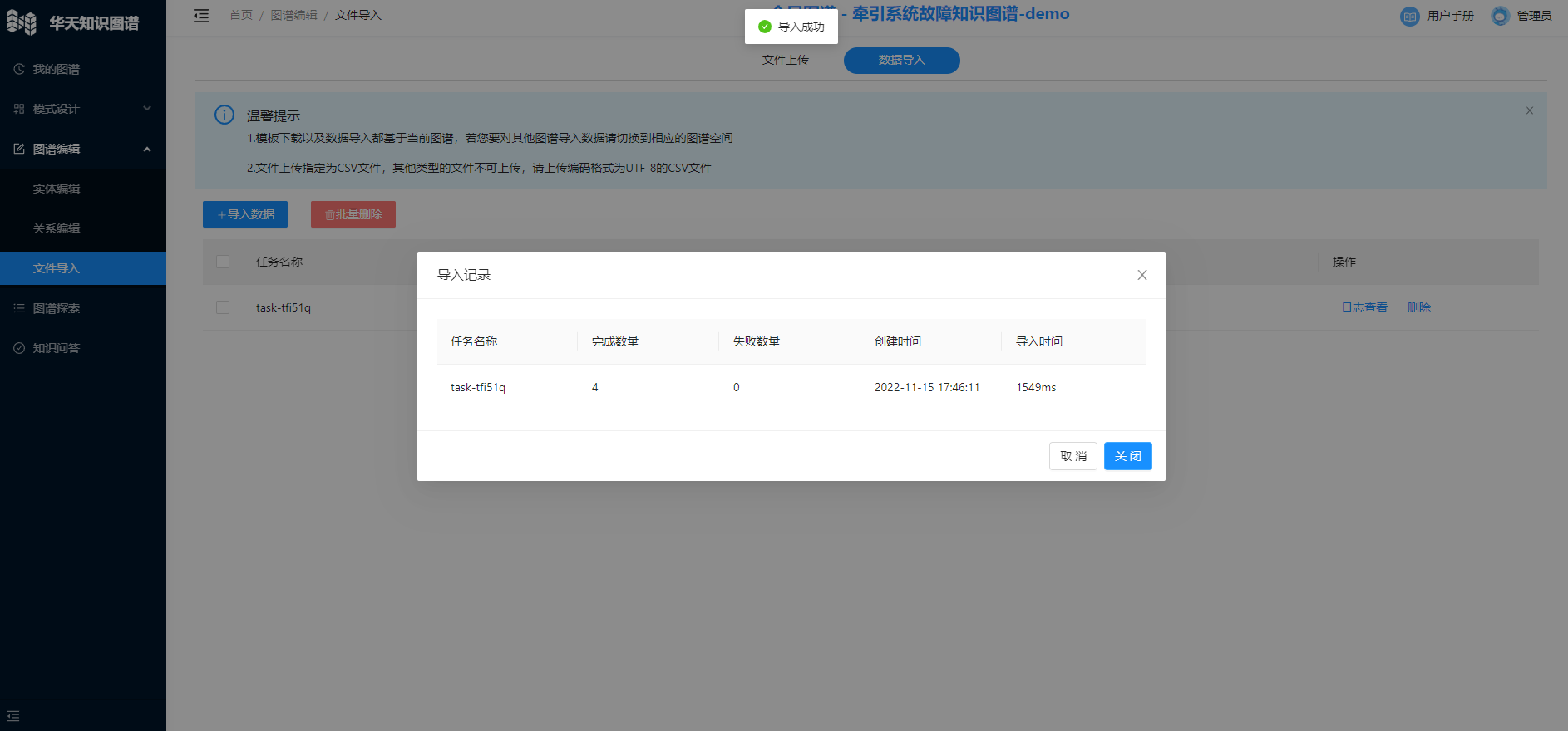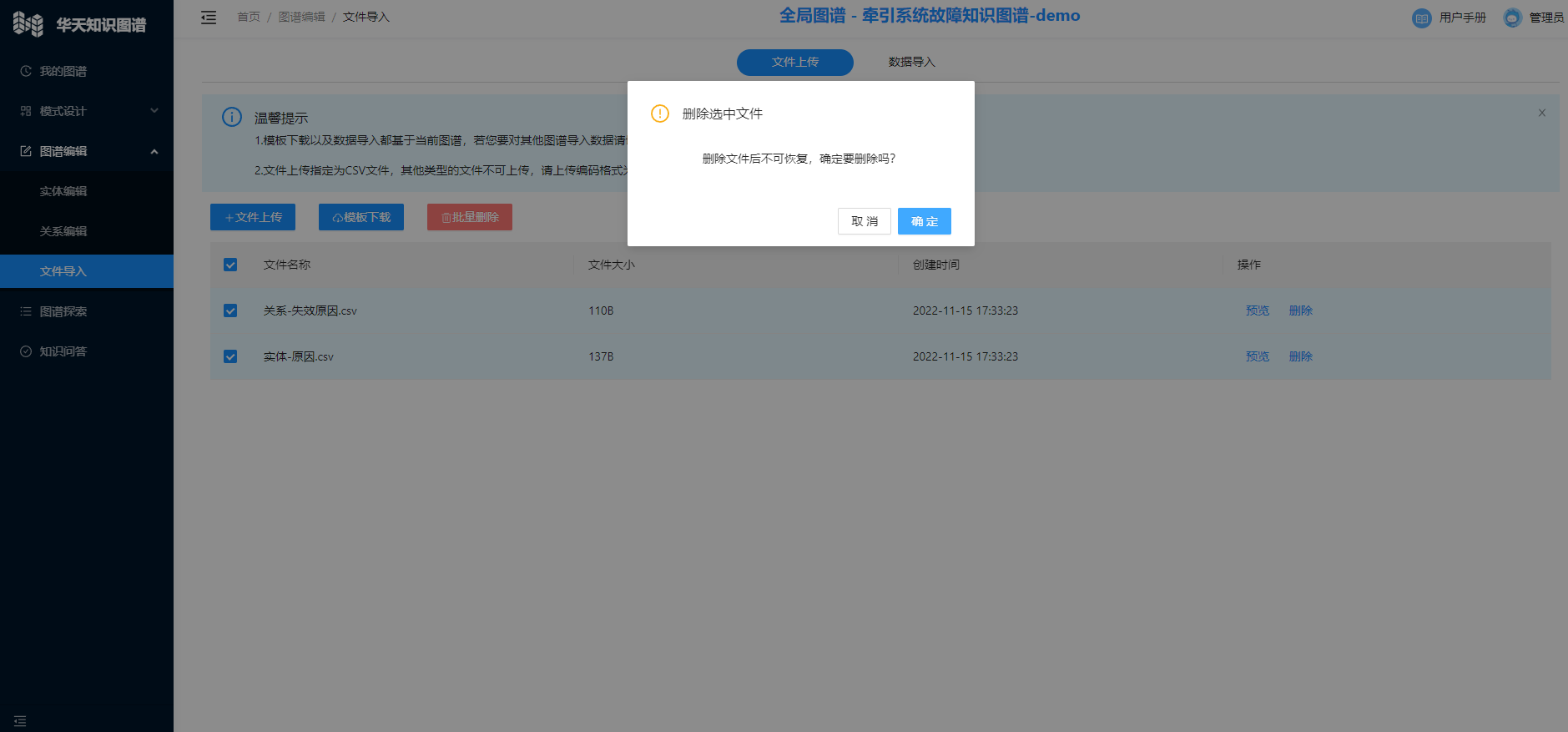 管理员身份登入系统有文件导入权限。可在图谱编辑-文件导入中实现。