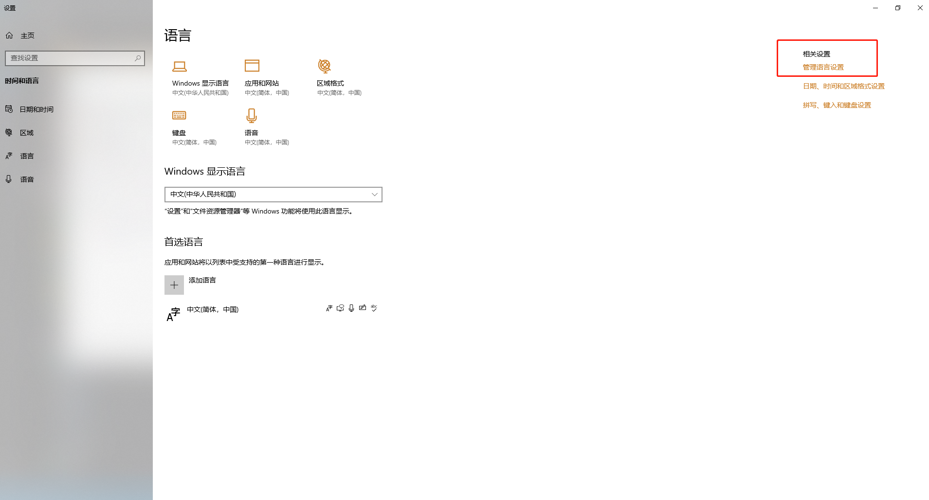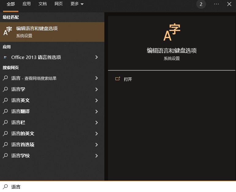 按 win+s 键输入“语言”,选择如下最佳匹配: