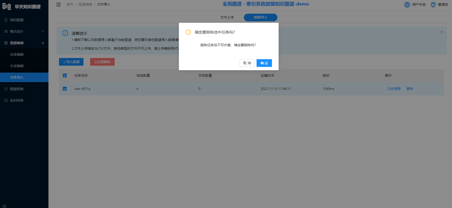 数据导入支持批量删除功能,用户可以在左侧多选框选中要批量删除的文件,点击“批量删除”按钮进行删除。亦可点击右侧“删除”删除任务。